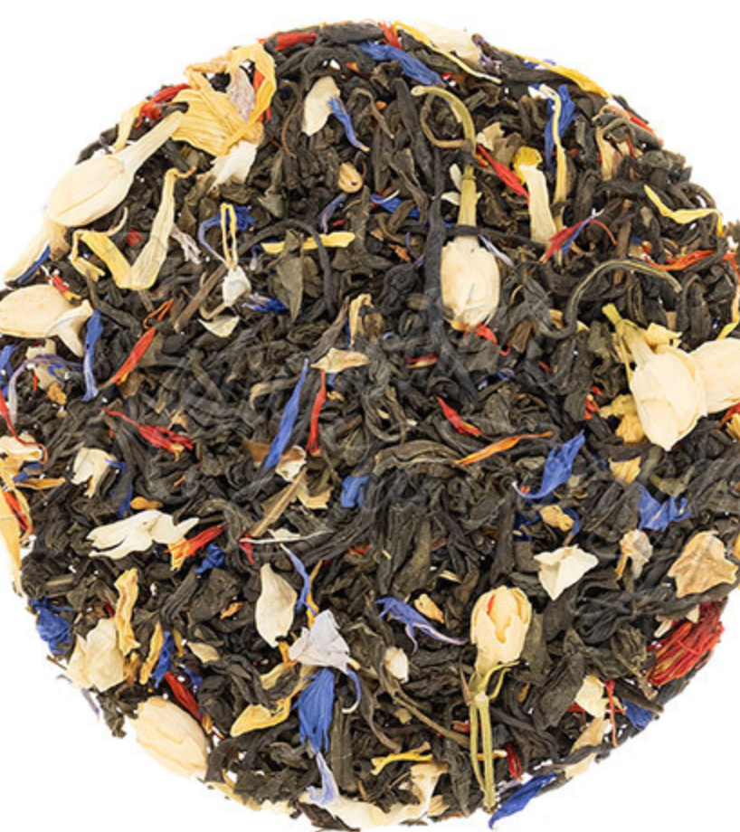 Sunshine & Rainbows is a delicate green tea blend that celebrates the beauty of botanicals. Jasmine flowers provide a naturally sweet, floral foundation, while sunflower, cornflower, osmanthus, safflower, and calendula petals add visual warmth and subtle aromatic layers. Each sip delivers a graceful jasmine-forward taste with gentle complexity. Perfect for moments when you want to slow down and savor something thoughtfully crafted.